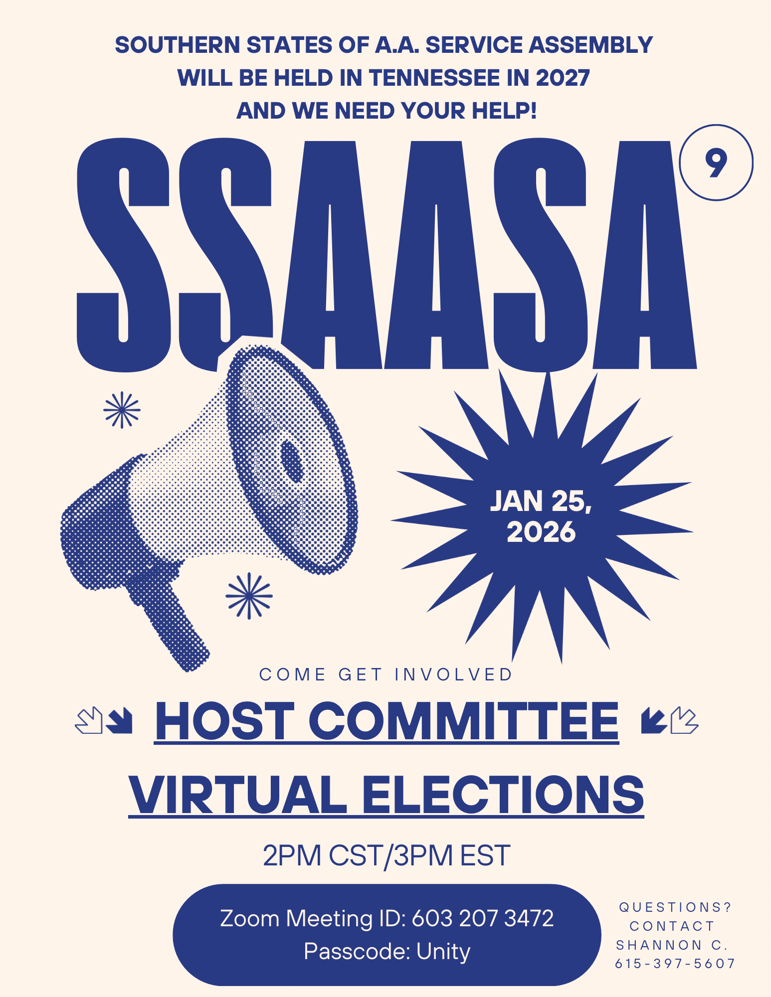 2027 SSAASA Host Committee Virtual Elections – Area 64 Hosted ***** New Date and Time ***** The elections for SSAASA host committee will be held Sunday February 15th at 2pm central/3pm eastern time Zoom 603 207 3472 Passcode Unity No results Recent CommentsArchives Categories No categories Meta Register Log in Entries feed Comments feed WordPress.org
