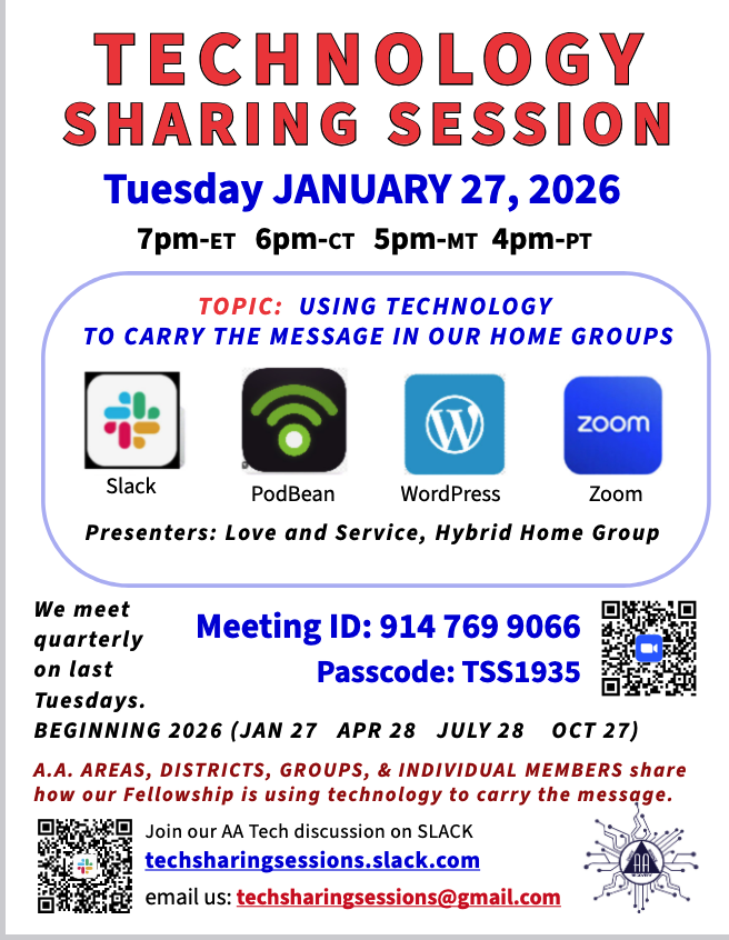 Share how your Area, District, Homegroup, and Members use Technology use technology to carry the message in our Fellowship.  Meets Quarterly.